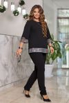 Жіночий комплект двійка, що складається з класичних штанів та блузки. Комплект виконаний з обробкою з сітки та тканини з паєтками. Блузка напівприлеглого силуету На рукавах є горизонтальні вставки з сітки, обрамлені деталями з паєток. Виріз горловини округлий.