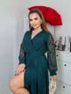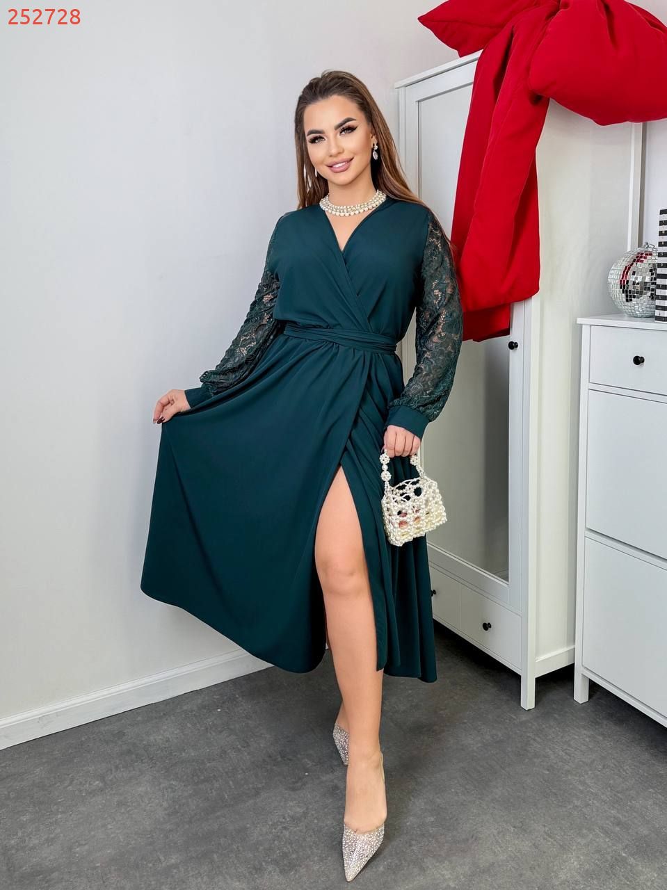 Неймовірно жіночна ошатна сукня у вечірньому стилі, довжиною міді. Сукня виконана із тканини софт (розтяжності немає). Ліф та спідниця мають запАх, по талії зібрано на резинку. Рукави виготовлені із дуже гарного гіпюру, на манжеті. Пояс із основної тканини в комплекті. Кишень та застібок немає