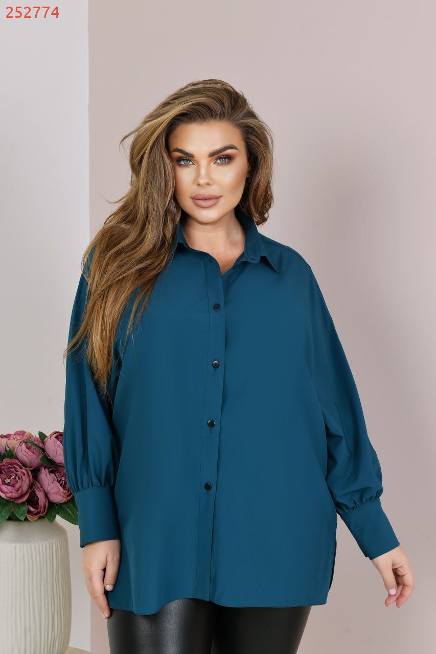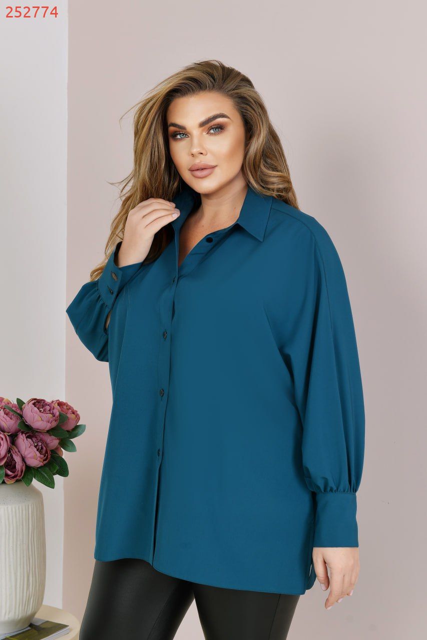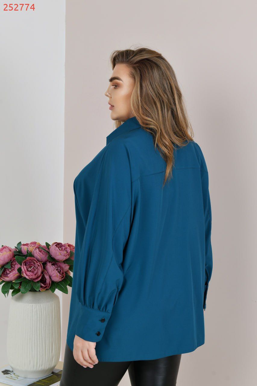 Блузка має прямий вільний та подовжений силует, рукав довгий цільнокроєний, на високому манжеті з гудзиком. Комірець зі стікою. Застібається блузка на гудзики по передній планці.
