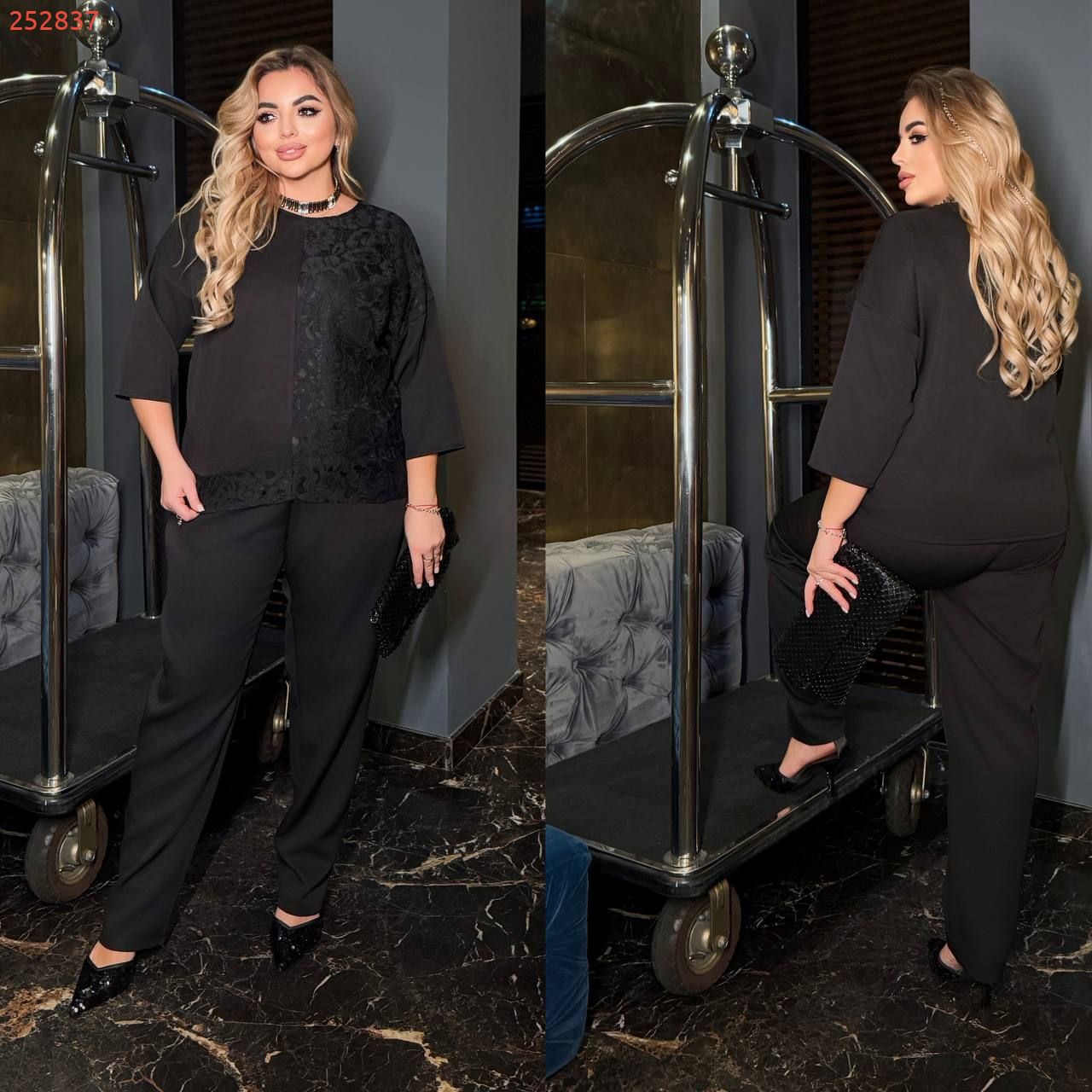 Довжина штанів : 110 см. Святковий костюм двійка . Штани з високою посадкою , пояс на гумці . Кофта прямого покрою комбінована , рукав 3/4 .