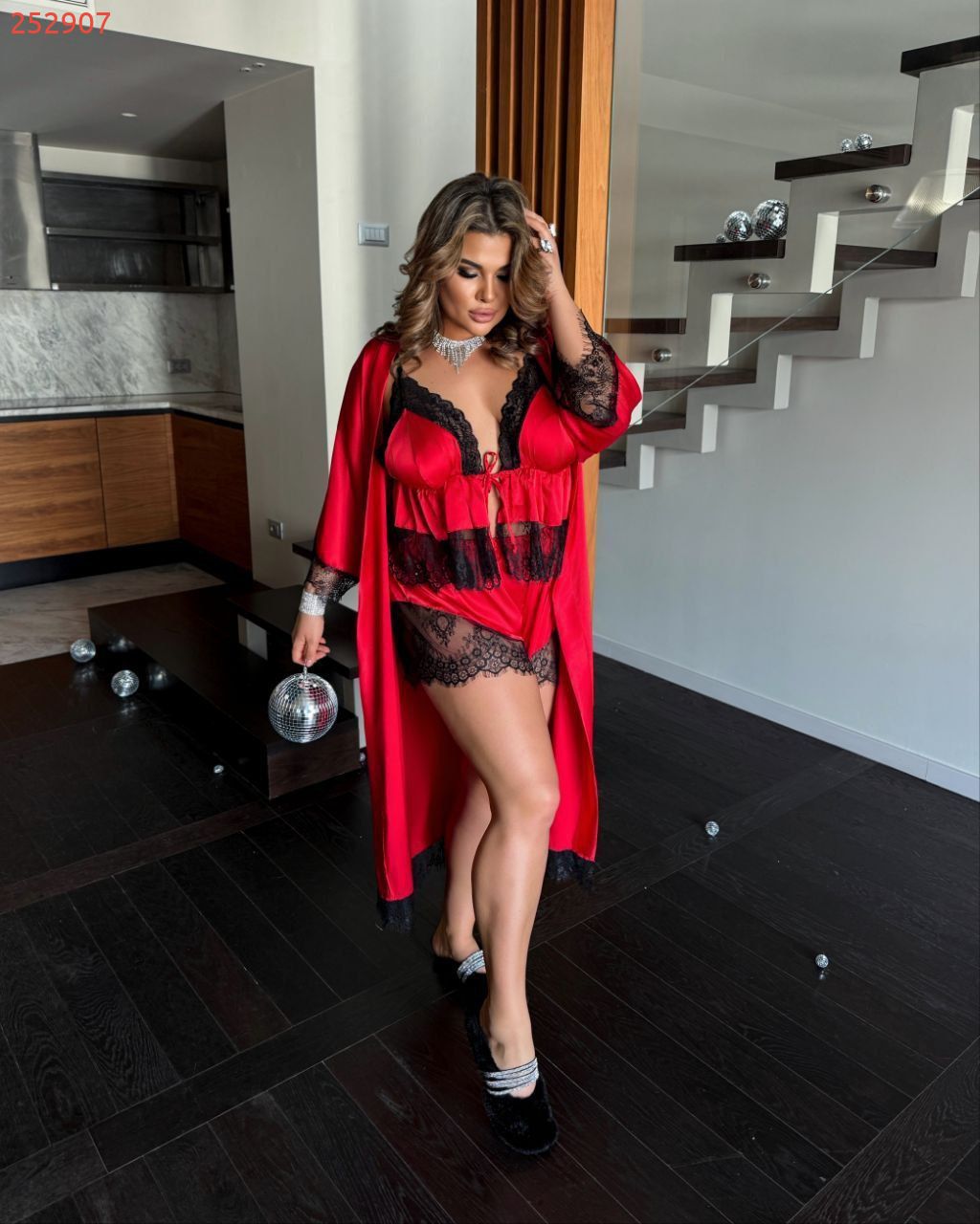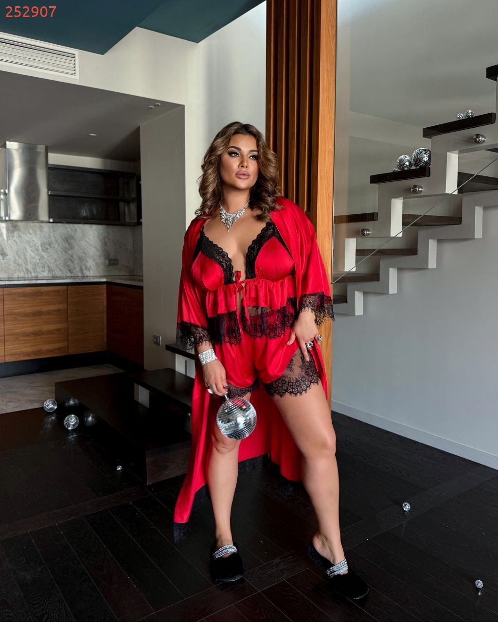 Піжама - Комплект. шорти+пенюар. шорти на гумці з широким мереживом внизу шорт. Пенюар на регульованій бретелі, з мереживом по грудях та під грудьми, гумка під грудьми.