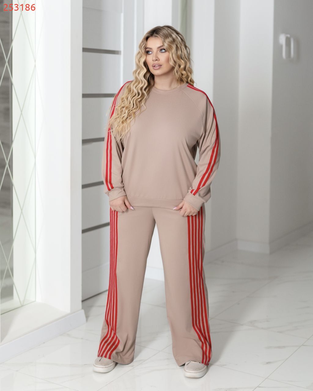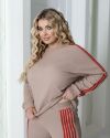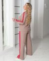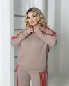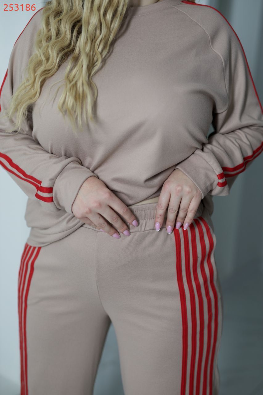 Стильний прогулянковий костюм, штани на високій посадці, кругова резинка. Кофтинка вільного крою, декорована стильними лампасами. Костюм виготовлений з теплої, м'якої, приємної до тіла тканини, має розтяжність. Контрастні лампаси візуально витягують сілует та роблять стрункіше.