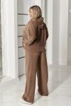 Штани -висока посадка, з кишенями, пояс на резинці, силует : прямий, вільний, низ штанин оснащений декоративним регулятором-стопером, який дозволяє змінювати ширину – від прямої до злегка стягнутої.