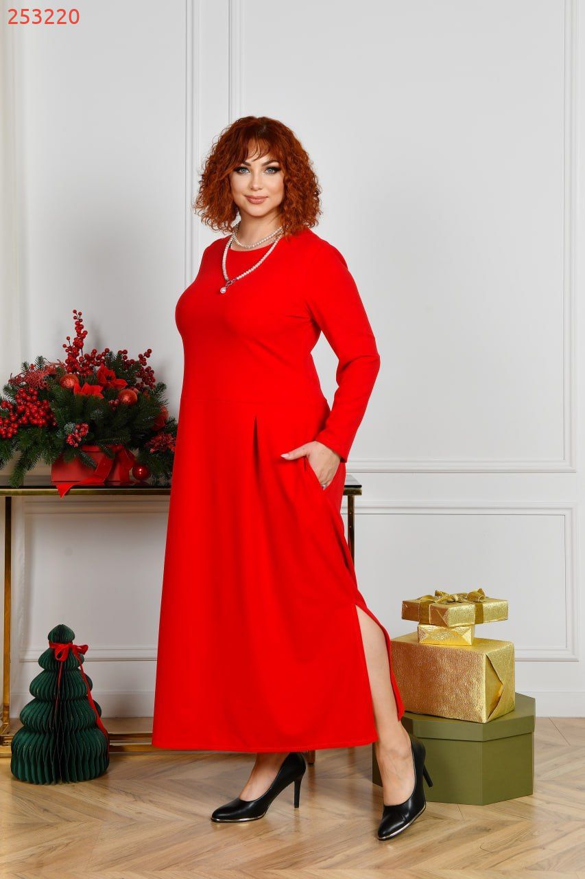 Силует сукні довгий, напівприталений. Виріз горловини круглий, рукави повної довжини. Лінія талії відрізна, трохи занижена, спідниця із защипами, в бічних швах оброблені кишені. Застібки немає. Внизу з боків розрізи, що додає образу жіночності. Сукня добре приховує будь-які недоліки та робить силует стрункішим. Ідеально підійде як для повсякденних справ, так і на свята, якщо додати аксесуарів.