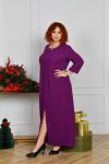 Довга сукня вільного прямого силуету з оригінальним вирізом горловини, яка декорована прикрасою з перлинками. Рукав прямий, трохи вкорочений. Попереду внизу оброблено розріз, що додає образу витонченості та стрункості. Застібок, кишень немає.