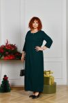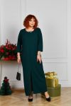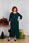 Довга сукня вільного прямого силуету з оригінальним вирізом горловини, яка декорована прикрасою з перлинками. Рукав прямий, трохи вкорочений. Попереду внизу оброблено розріз, що додає образу витонченості та стрункості. Застібок, кишень немає.