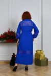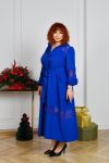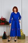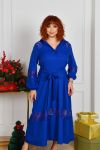 Силует у вигляді трапеції, талію можна падкреслити за допомогою поясу із основної тканини. По горловині стояче-відкладений комірець, попереду коротка планка із гудзиками. Рукави довгі, по низу на резиночці. Сукня декорована дуже якісним та гарним гіпюром. Кишень немає. Можна носити з поясом та без нього.