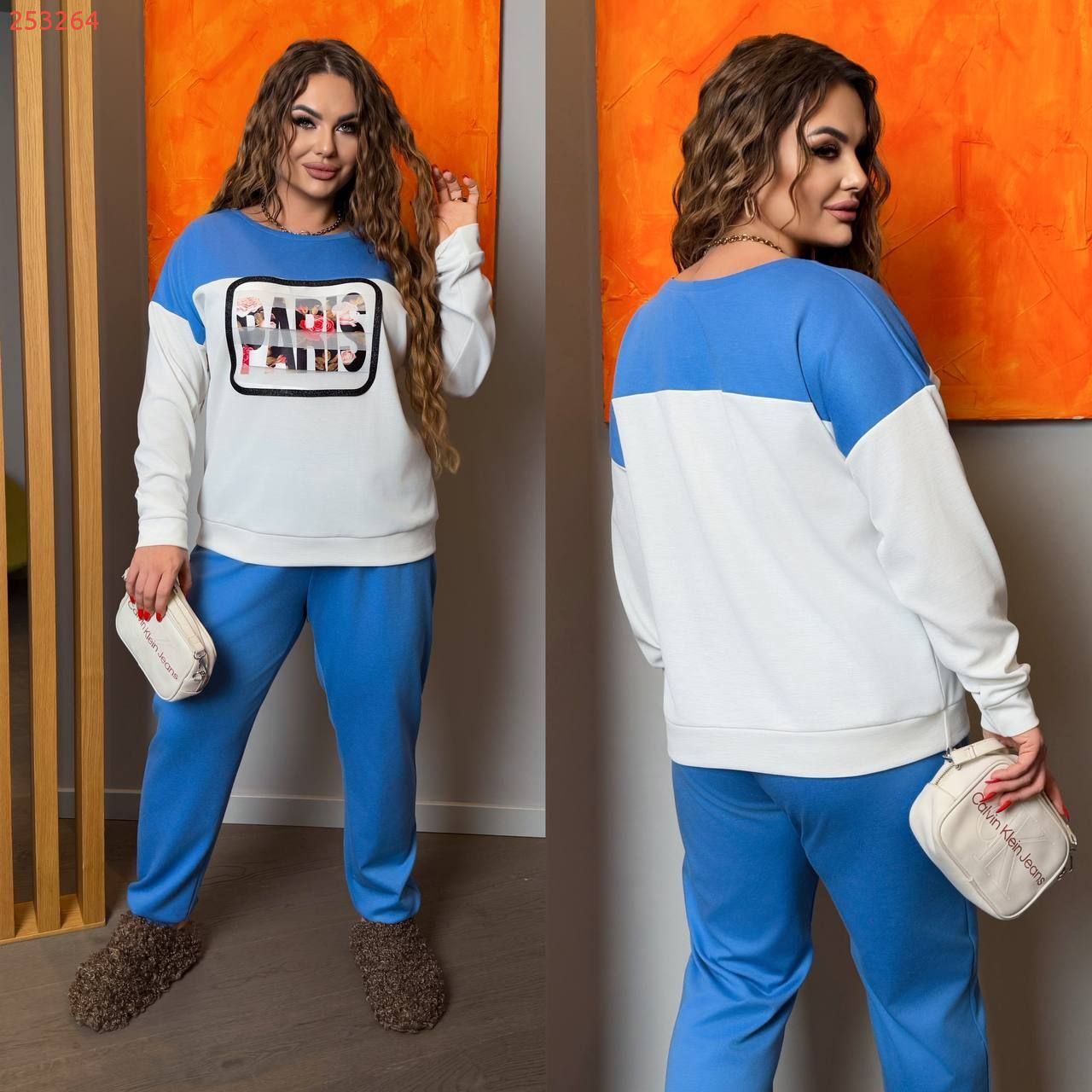 Довжина штанів : 106 см. . Штани з високою посадкою , пояс на гумці . Кофта прямого покрою з нашивкою .