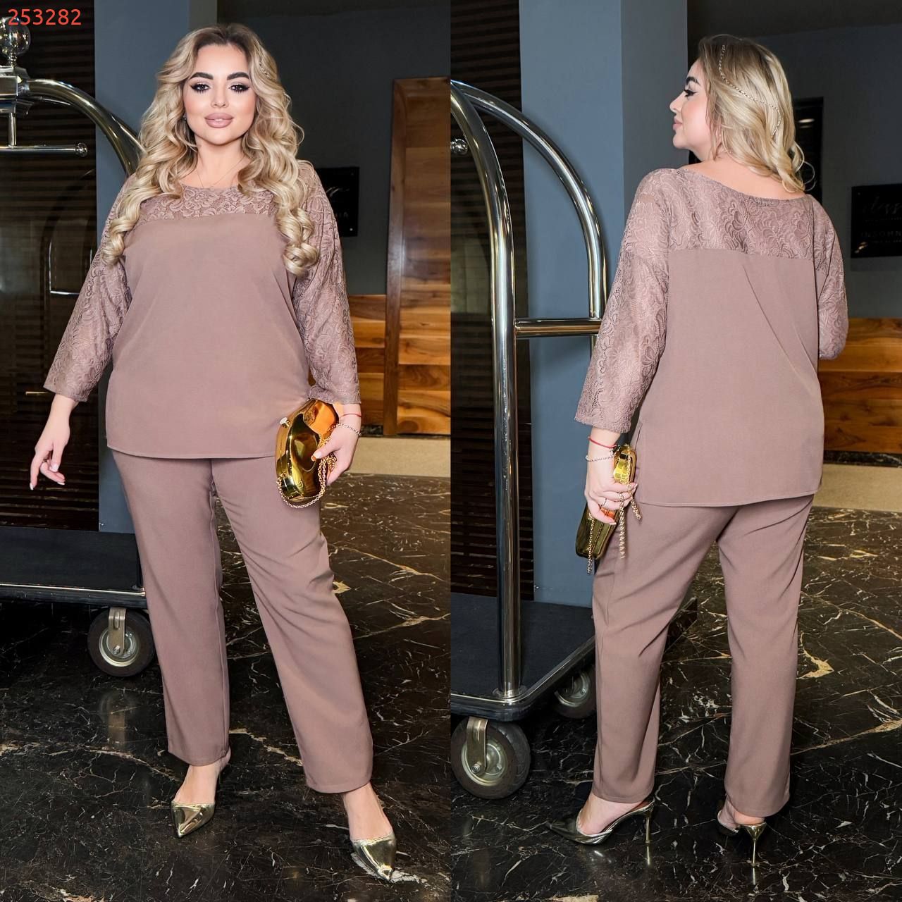 Довжина штанів : 105 см. Святковий костюм двійка . Штани з високою посадкою , пояс на гумці . Кофта прямого покрою комбінована , рукав 3/4