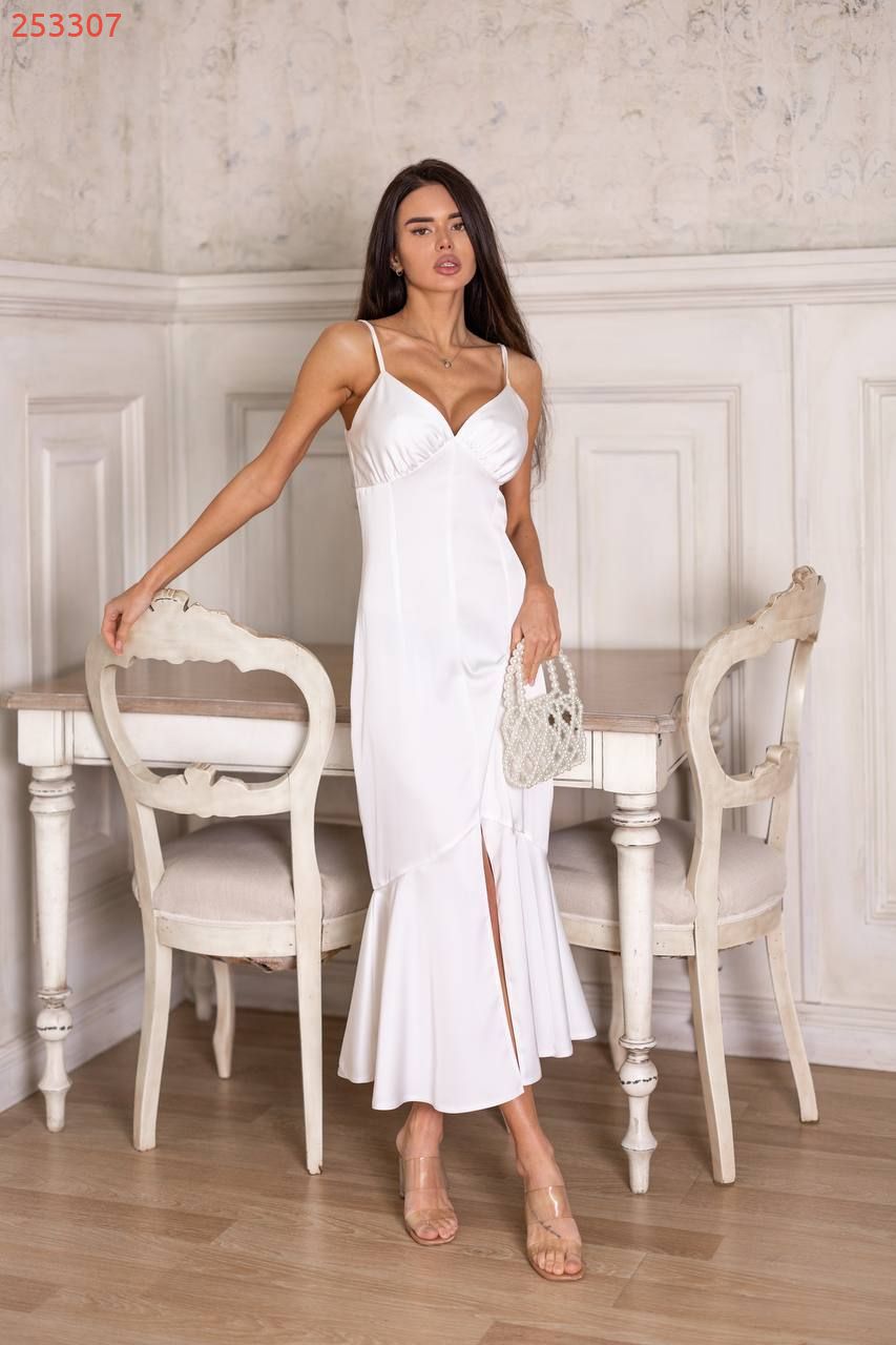 Легкий розкльошений низ із кокетливим розрізом додає образу руху та легкої чуттєвості, а м’який сатиновий блиск тканини робить сукню ідеальним вибором для свята, вечора у ресторані чи зйомки.