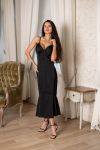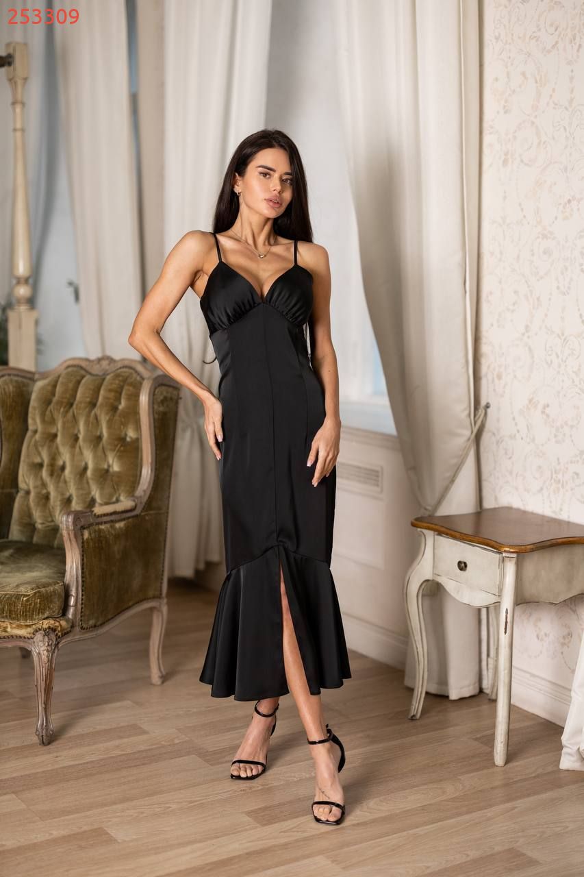 Легкий розкльошений низ із кокетливим розрізом додає образу руху та легкої чуттєвості, а м’який сатиновий блиск тканини робить сукню ідеальним вибором для свята, вечора у ресторані чи зйомки.