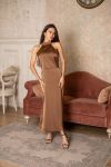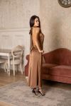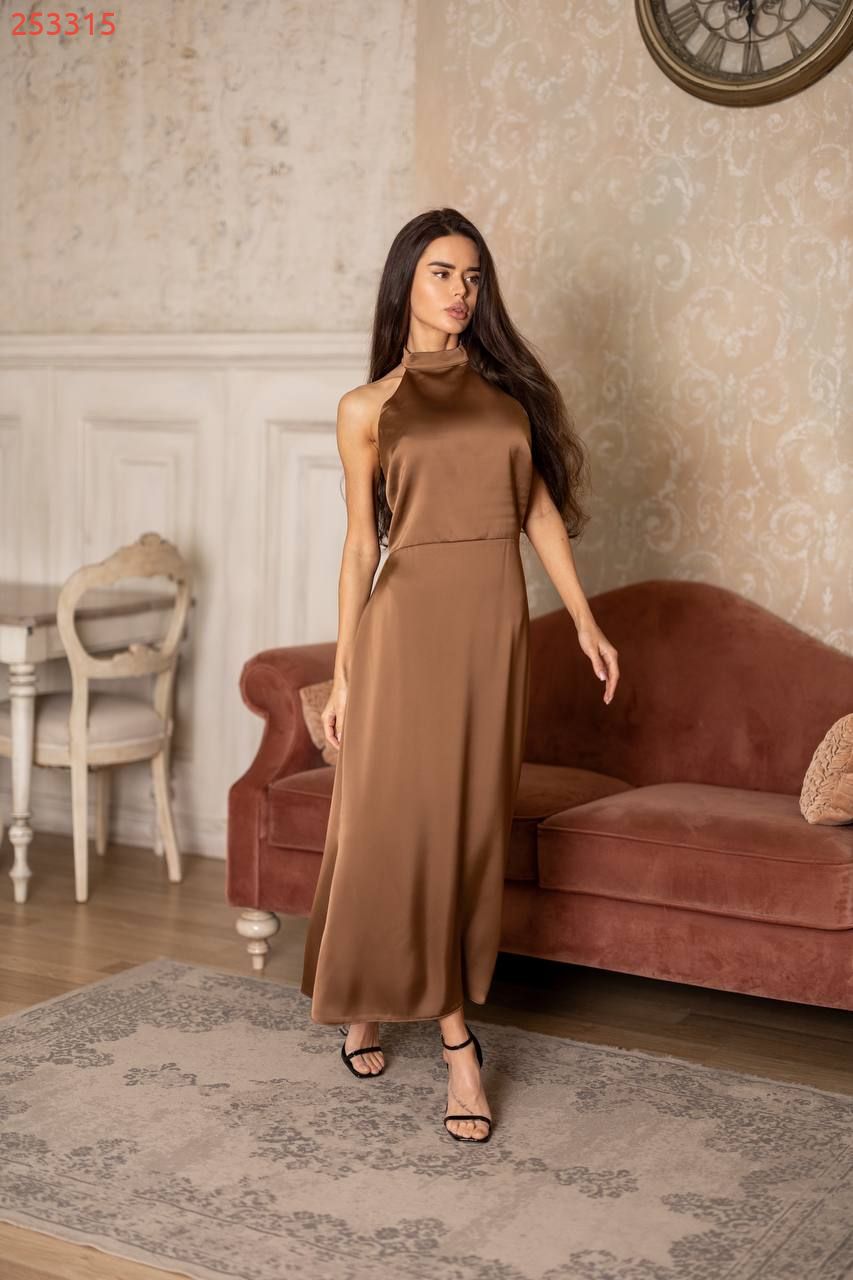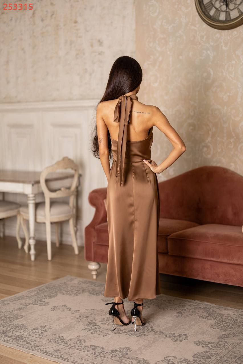 Елегантна шовкова сукня максі зі стійкою та акцентом на відкритій спині. Струменева тканина підкреслює силует, а зав'язки на шиї додають витончену деталь. Лаконічний крій робить модель ідеальною для вечора, зйомки або урочистого виходу.