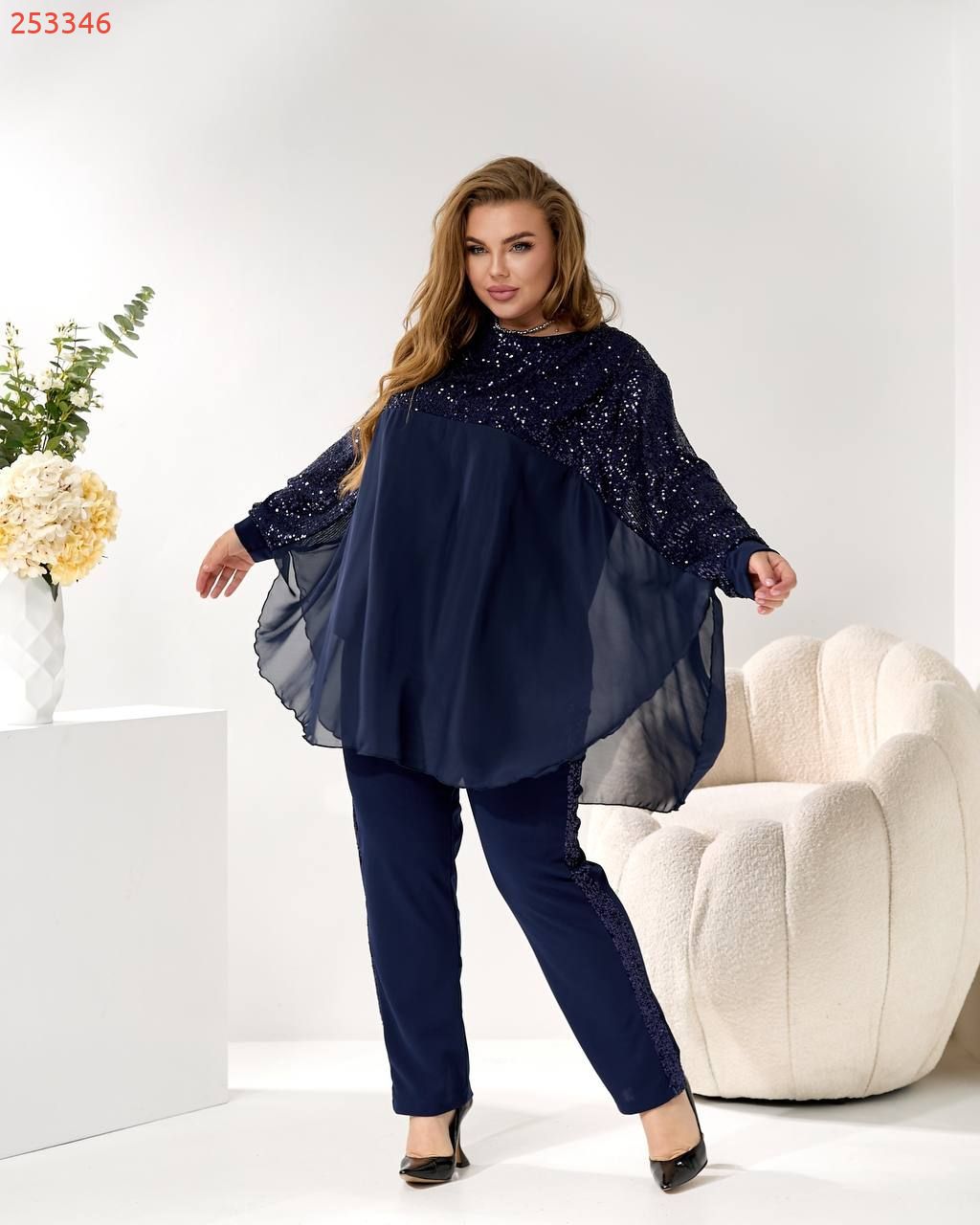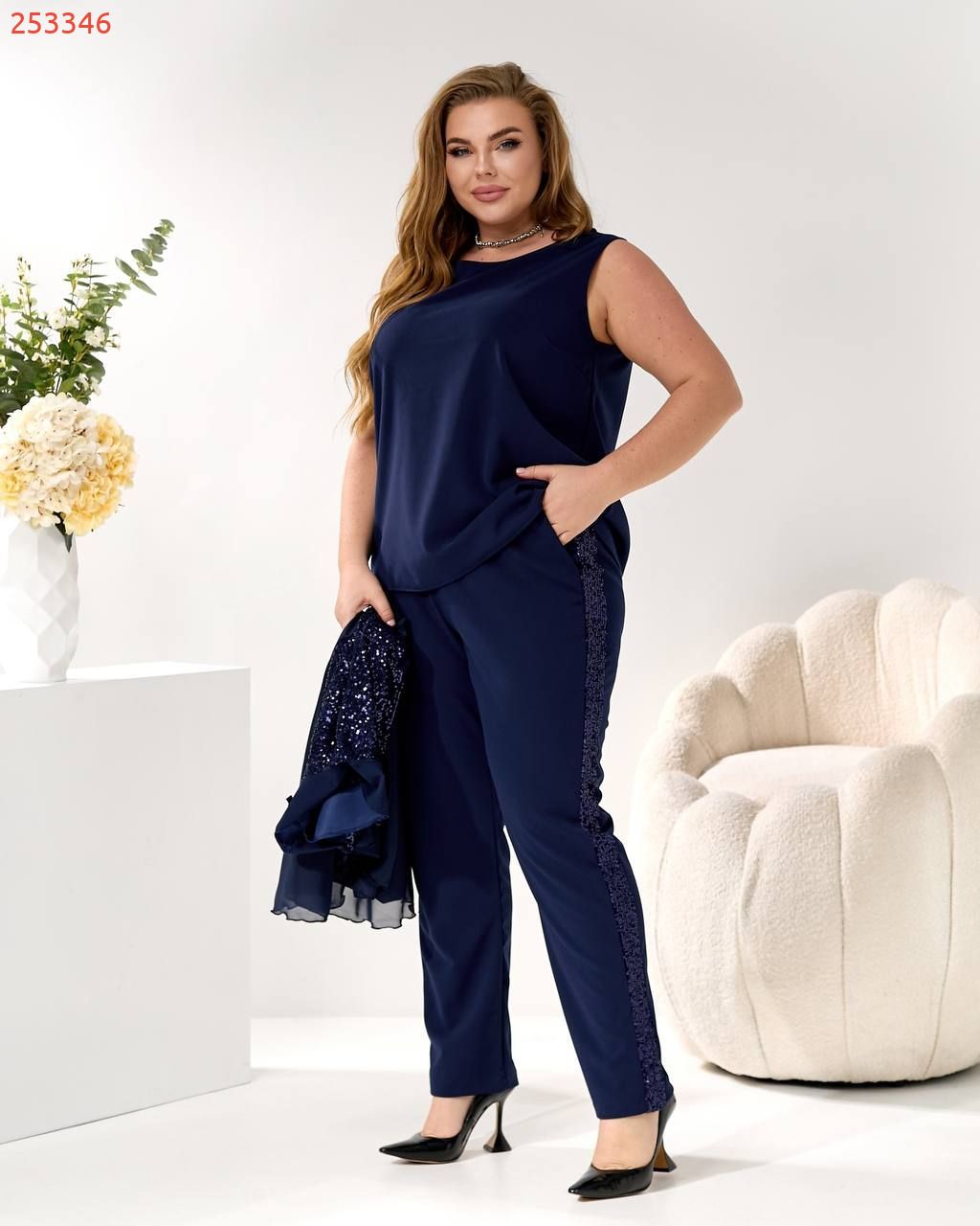 2. Штани (Брюки): Прямого/трохи звуженого силуету, з креп-дайвінгу, з лампасами з паєтки, що візуально витягують силует!