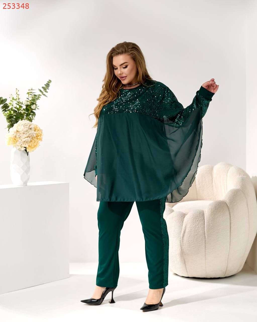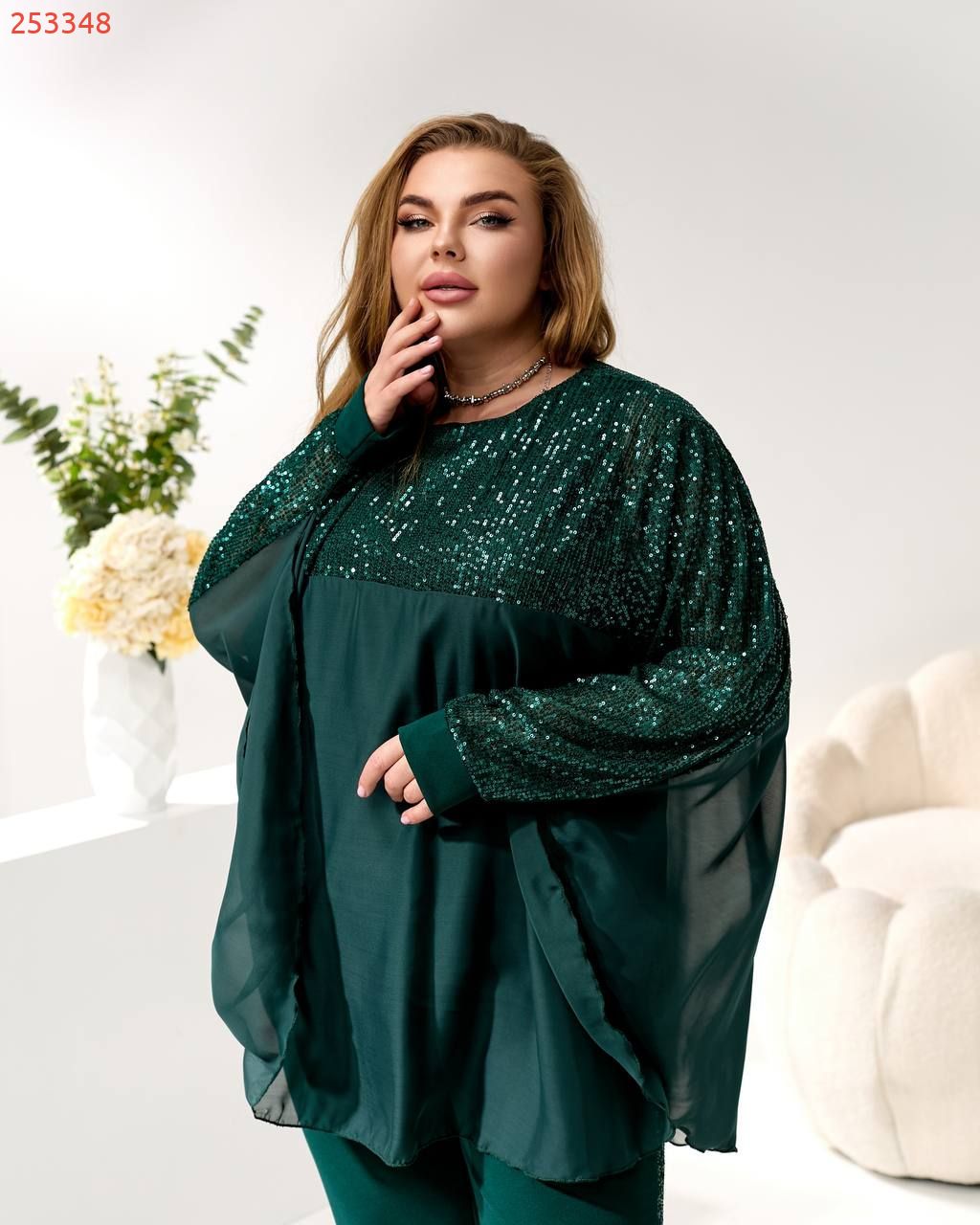 3. Накидка/Туніка: Вільний, летючий крій з шифону з оздобленням паєтками на плечах та рукавах. Можна носити поверх майки або як стильний жакет.