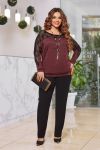 Ефектний комплект, в якому поєднується краса та якість. Комплектація з блузи та штанів. Ошатна блузка напівприлеглого силуету з ангори з елегантним мерехтінням. Горловина округлої форми. Спинка із середнім швом, що переходить у застібку на навісну петлю і гудзик.