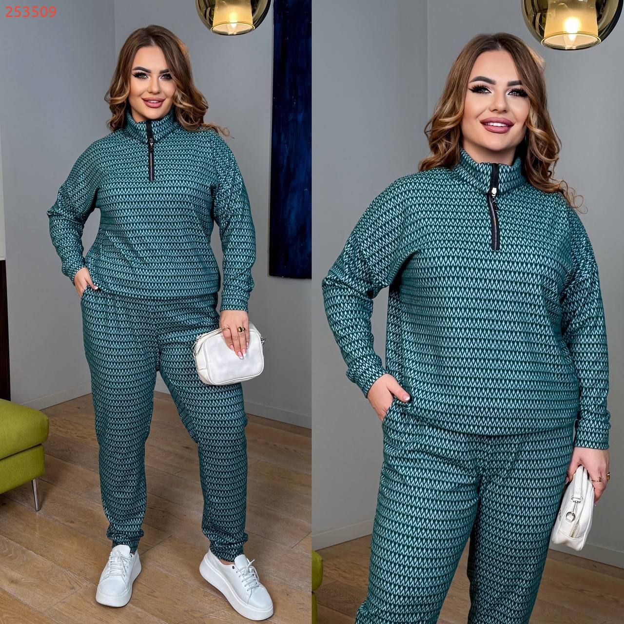 Довжина штанів : 106 . Штани з високою посадкою , пояс на гумці , низ на манжеті . Кофта прямого покрою на манжеті , з коміром на блискавці .