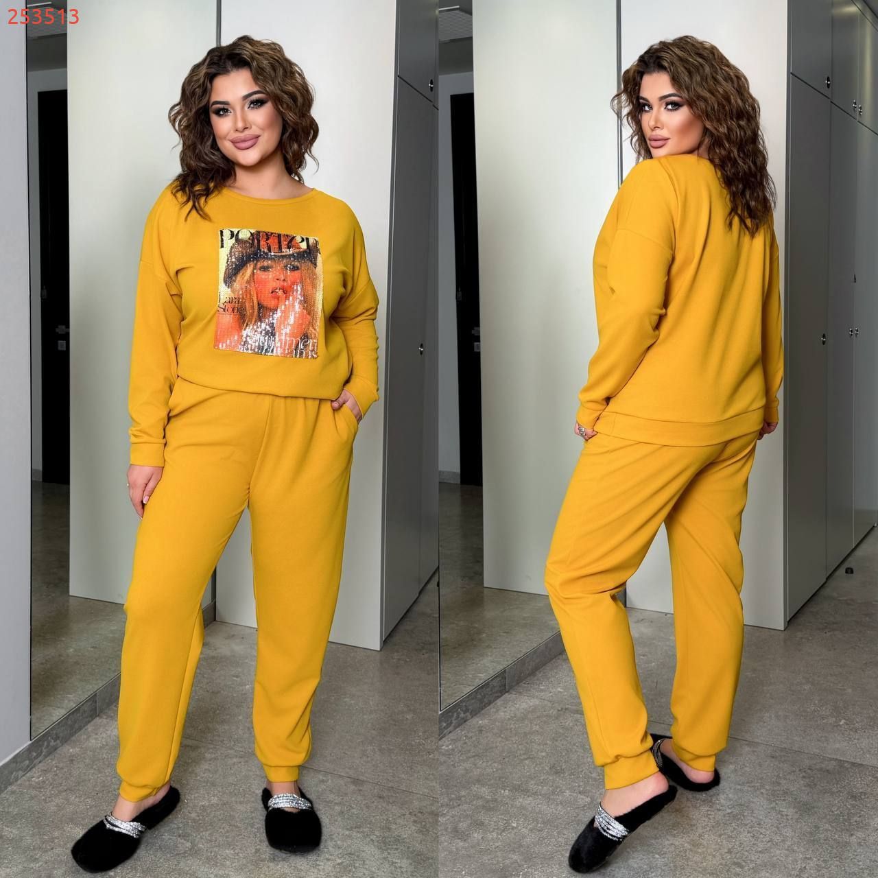 Довжина штанів : 106 см. . Штани з високою посадкою , пояс на гумці . Кофта прямого покрою з нашивкою .