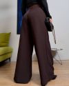 Широкий крій візуально подовжує ноги, висока посадка підкреслює талію. Щільна костюмна тканина не мнеться, добре тримає форму. Фігура виглядає стрункішою.