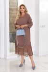 Сукня напівприлеглого силуету розширена до низу, виконана з крепу з пришивним декором. Виріз горловини круглий, по спинці застібка на одну петлю навісну і гудзик. По низу сукні пришитий прибраний волан. Сукня ідеально підійде для будь-якої урочистої події, залишаючись модною та актуальною незалежно від сезону та трендів.