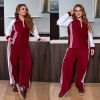Довжина штанів : 110 см. Штани з ломпасом , з високою посадкою , пояс на гумці , бічні кишені , низ на фіксаторі . Кофта з ломпасом прямого покрою , з коміром на блискавці , рукав реглан .