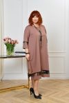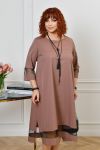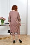 Сукня має А-подібний силует, та чудово приховує будь-які недоліки фігури. Виріз горловини круглий, рукав довжиною 3/4. Низ сукні та рукави мають декоративні вставки із мʼякої сіточки. З боків внизу є розрізи. В бічних швах оброблені кишені. Сукня ідеально підійде як для свят, так і на кожен день.