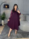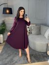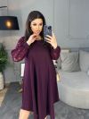 Силует сукні у вигляді трапеції, завдяки чому чудово маскує будь-які недоліки фігури та підкреслює її переваги. Виріз горловини круглий. Рукави на манжетах, виконані із гарного гіпюру в тон основної тканини. Низ сукні асиметричний. Застібок кишень немає.