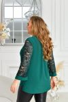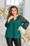 Виріз горловини V-подібний. Рукав трохи вкорочений, виконаний із високоякісного гіпюру, низ на манжеті. Низ блузи асиметричний, попереду трохи коротший. Застібок, кишень немає.