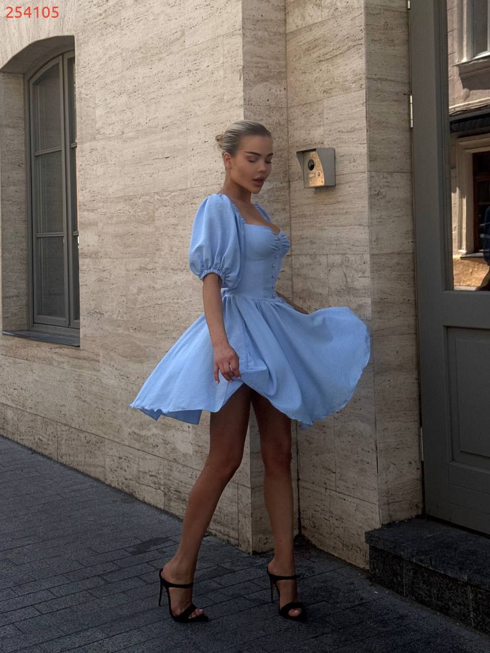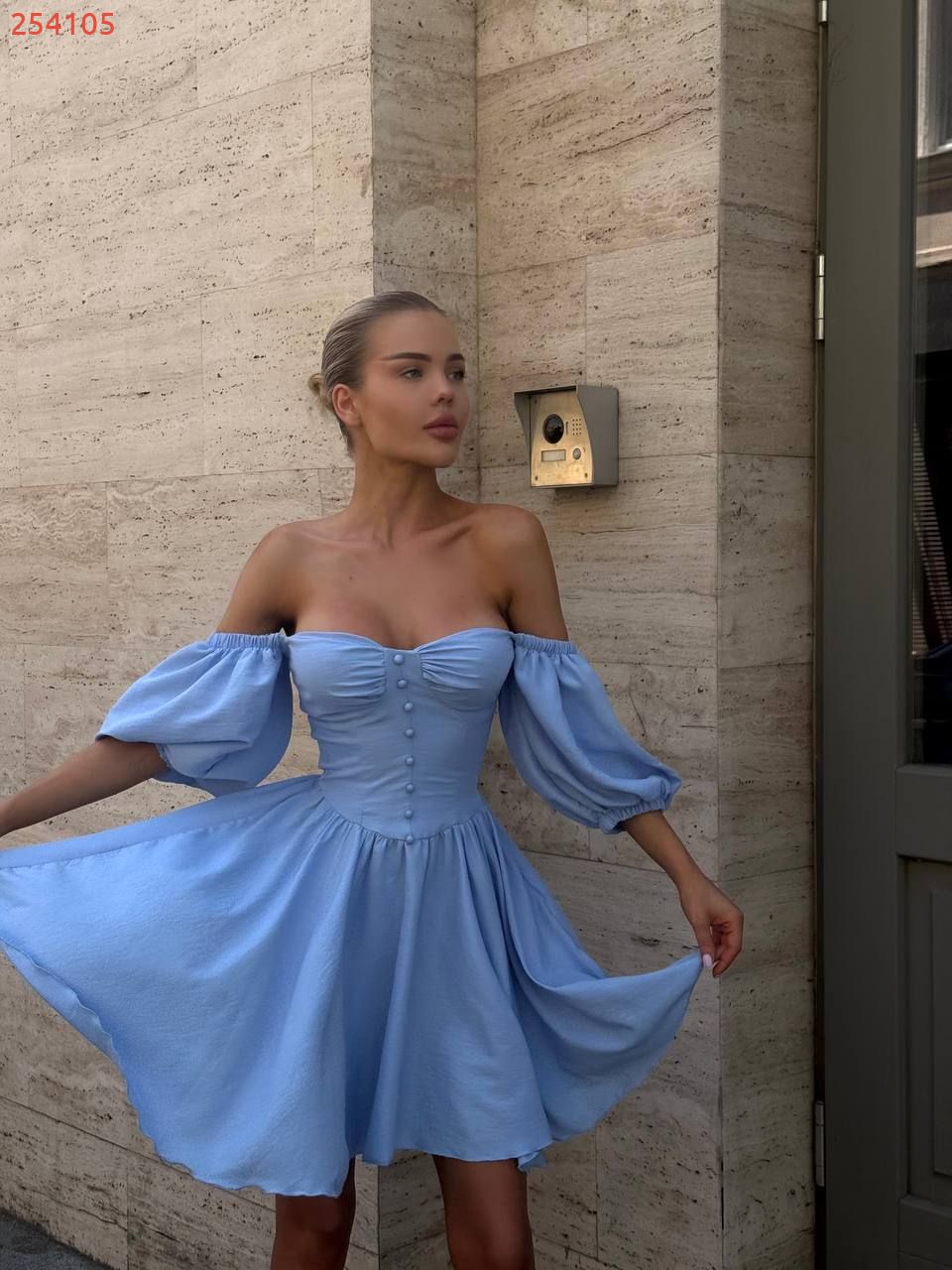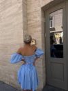 Модель стилізована обʼємним рукавчиком та пишною спідницею . Сукня має завʼязки на спинці, за допомогою яких можна регулювати обьєм декольте