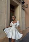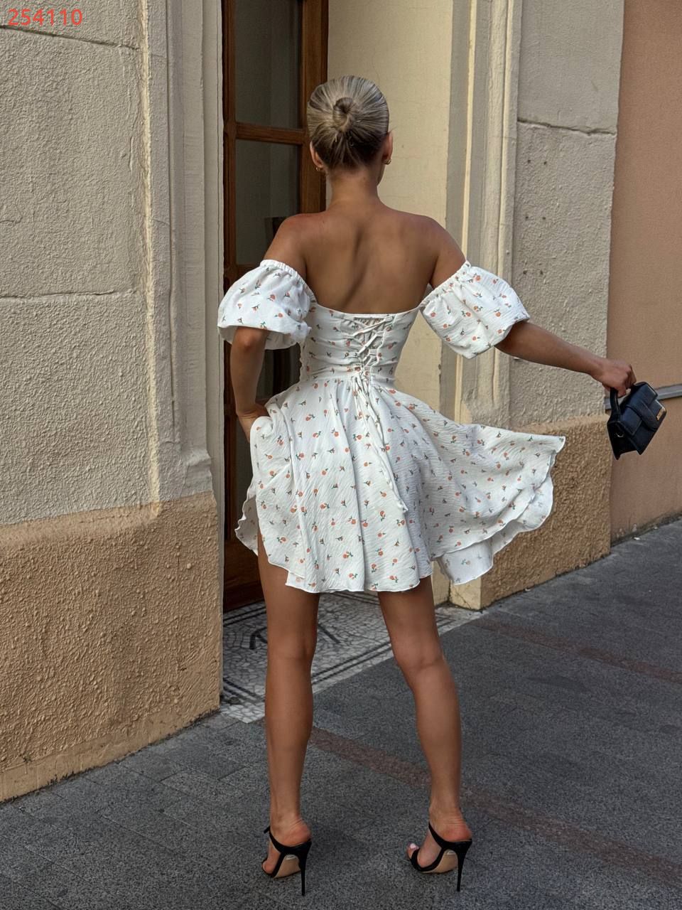 Модель стилізована обʼємним рукавчиком та пишною спідницею . Сукня має завʼязки на спинці, за допомогою яких можна регулювати обьєм декольте