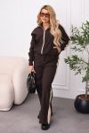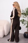 Стильний брючний костюм з еластичної тканини для тих, хто любить баланс комфорту й елегантності. Кофта та штани оздоблені лампасами: кофта на блискавці по всій довжині з прорізними кишенями та еластичним манжетом внизу. Штани середньої посадки з еластичною резинкою на поясі у стилі палаццо – витягують силует і пасують до будь-якого взуття, від кросівок до лоферів.