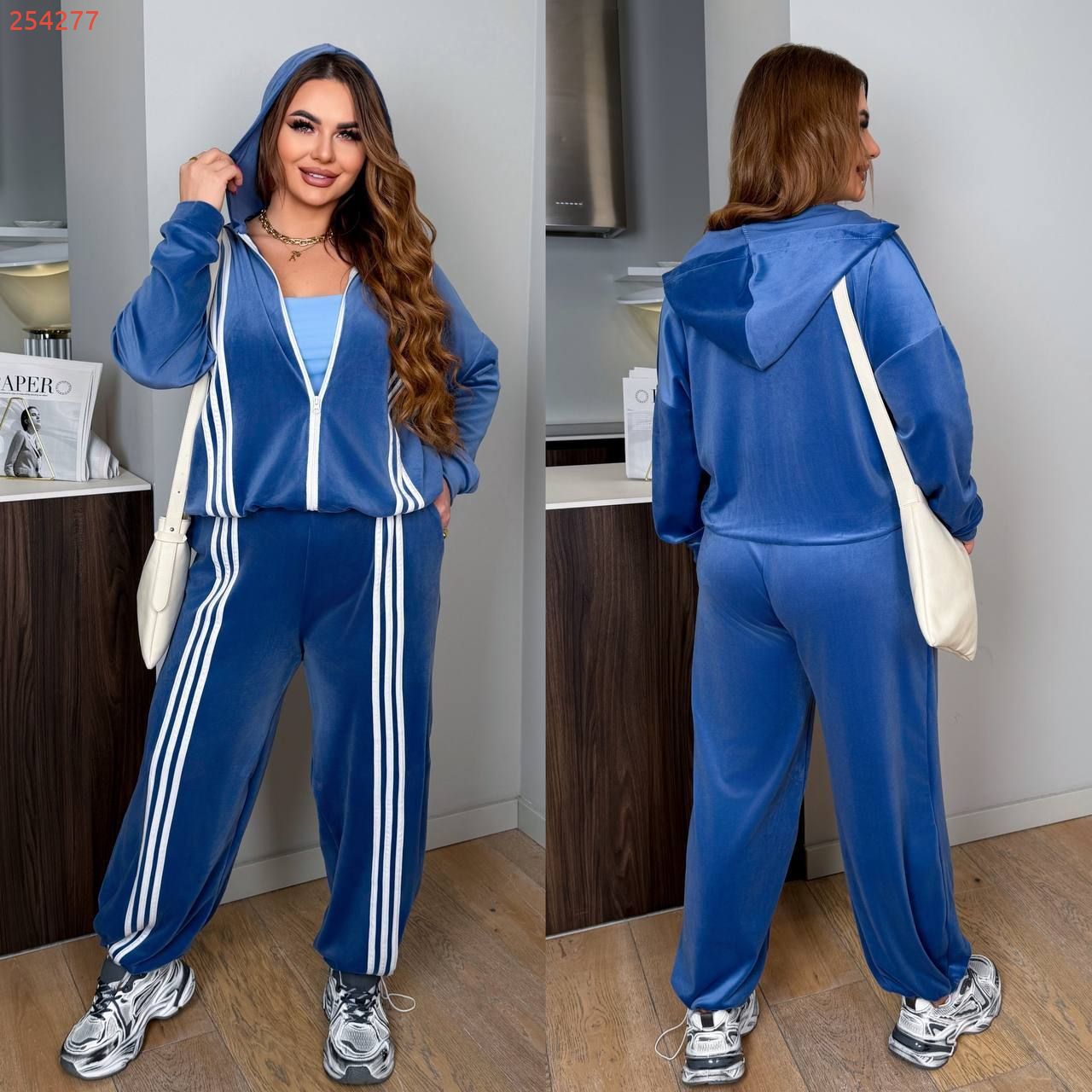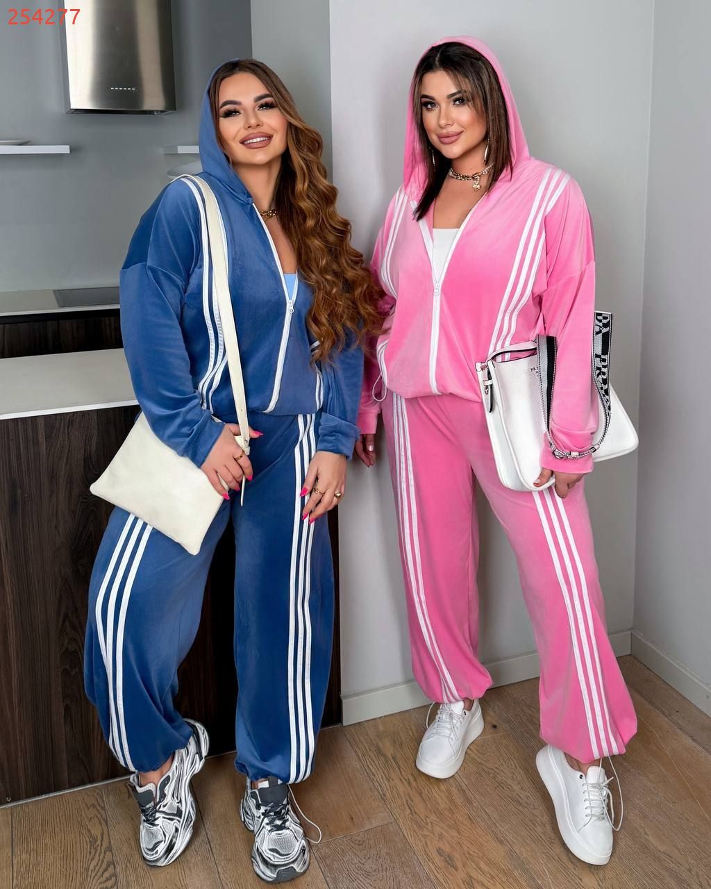 Довжина штанів : 106 см Штани з високою посадкою , пояс на гумці , ломпаси , бічні кишені , низ на фіксаторі . Кофта прямого покрою , з ломпасом , на блискавці , з капюшоном низ на фіксаторі .