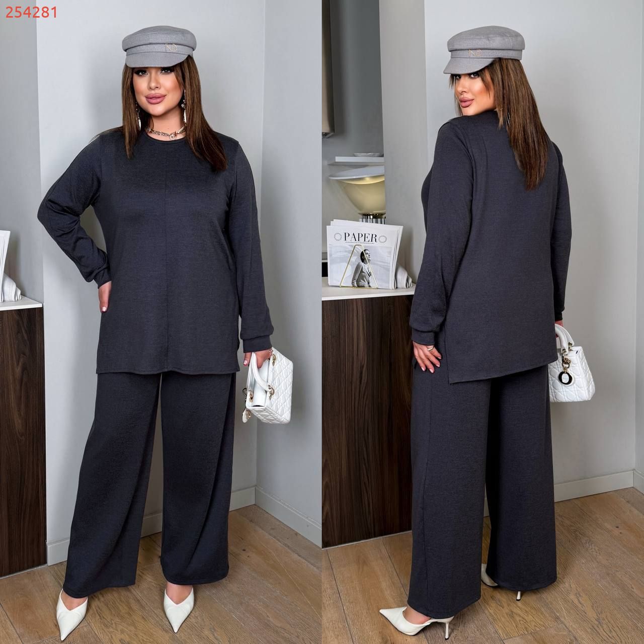 Довжина штанів : 106 см. Широкі штани з високою посадкою , пояс на гумці , бічні кишені . Кофта прямого покрою з бічними розрізами .