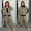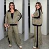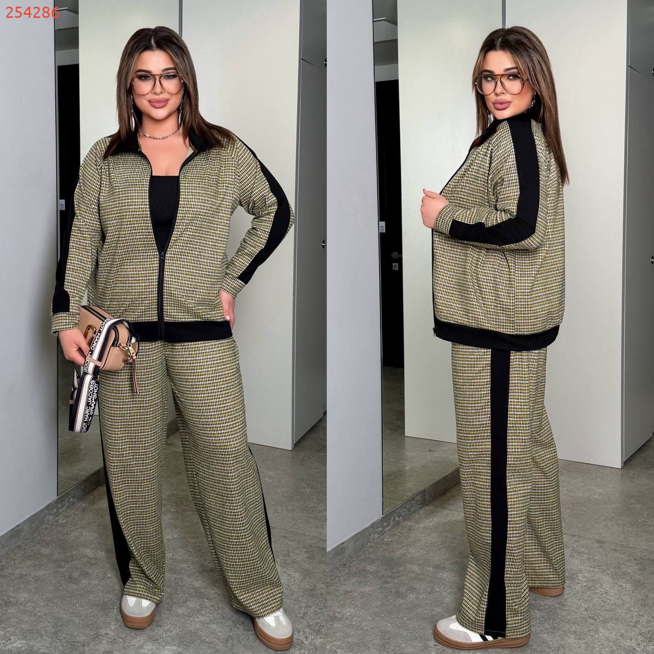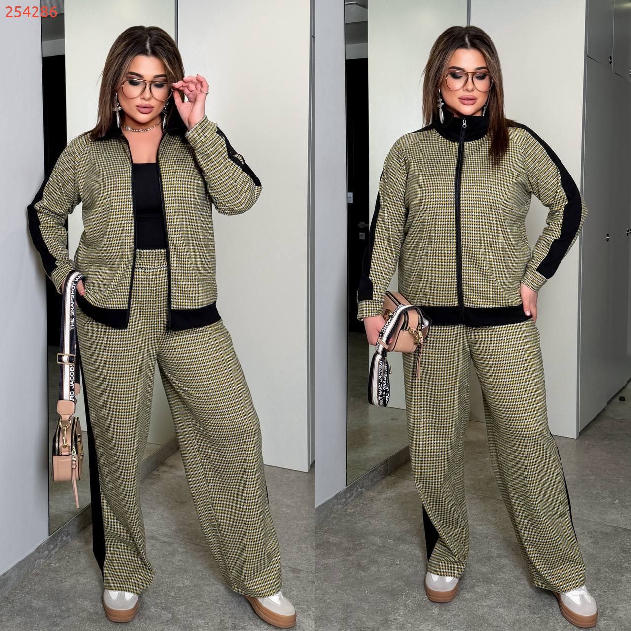 Довжина штанів : 106 см Штани з ломпасами , висока посадка , пояс на гумці , бічні кишені . Кофта прямого покрою , рукав з ломпасом , на блискавці .