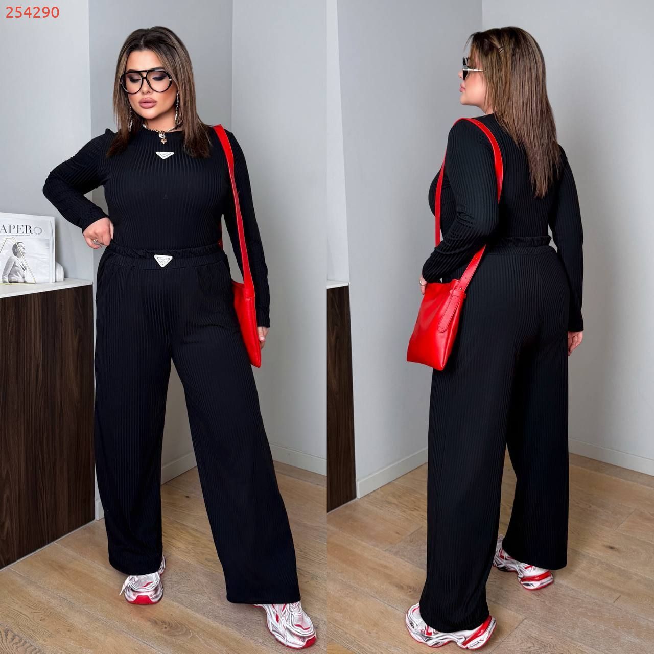 Довжина штанів : 106 см. Широкі штани з високою посадкою , пояс на гумці , бічні кишені . Кофта прямого покрою