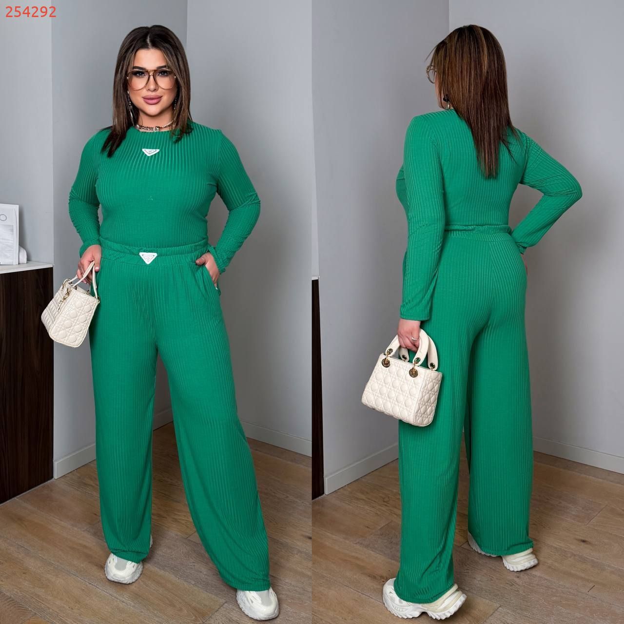 Довжина штанів : 106 см. Широкі штани з високою посадкою , пояс на гумці , бічні кишені . Кофта прямого покрою