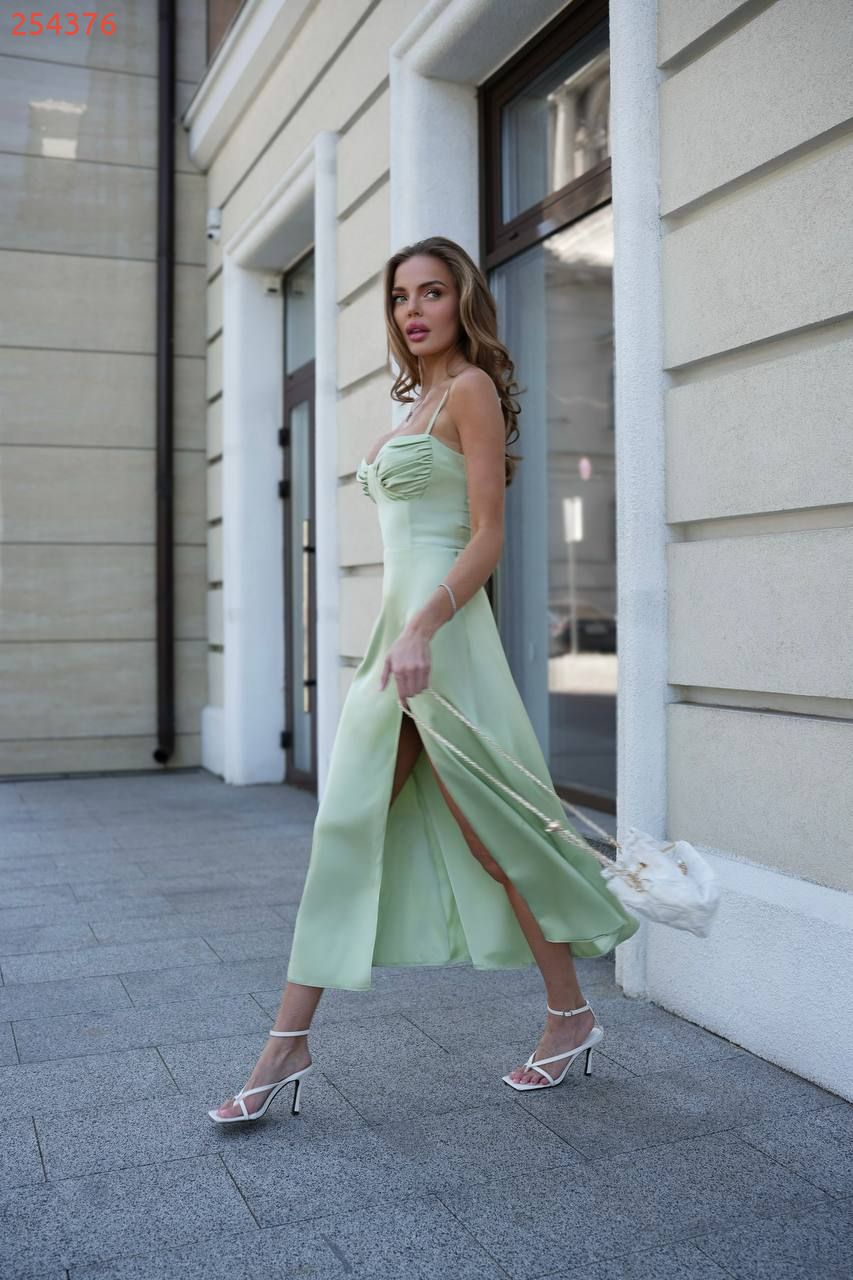 Сукня з ніжного даблшовку з акцентом на декольте - збірка на чашках візуально додає об'єм і підкреслює форму. Ефектний розріз на нозі додає витонченості та легкості. На спині - прихована блискавка та регульована шнурівка з корсетною імітацією для ідеальної посадки по фігурі.