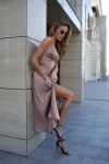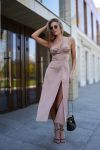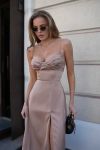Сукня з ніжного даблшовку з акцентом на декольте - збірка на чашках візуально додає об'єм і підкреслює форму. Ефектний розріз на нозі додає витонченості та легкості. На спині - прихована блискавка та регульована шнурівка з корсетною імітацією для ідеальної посадки по фігурі.