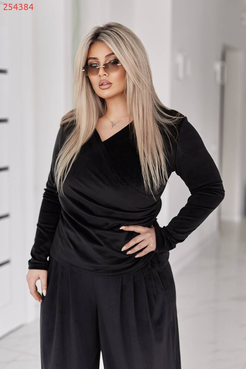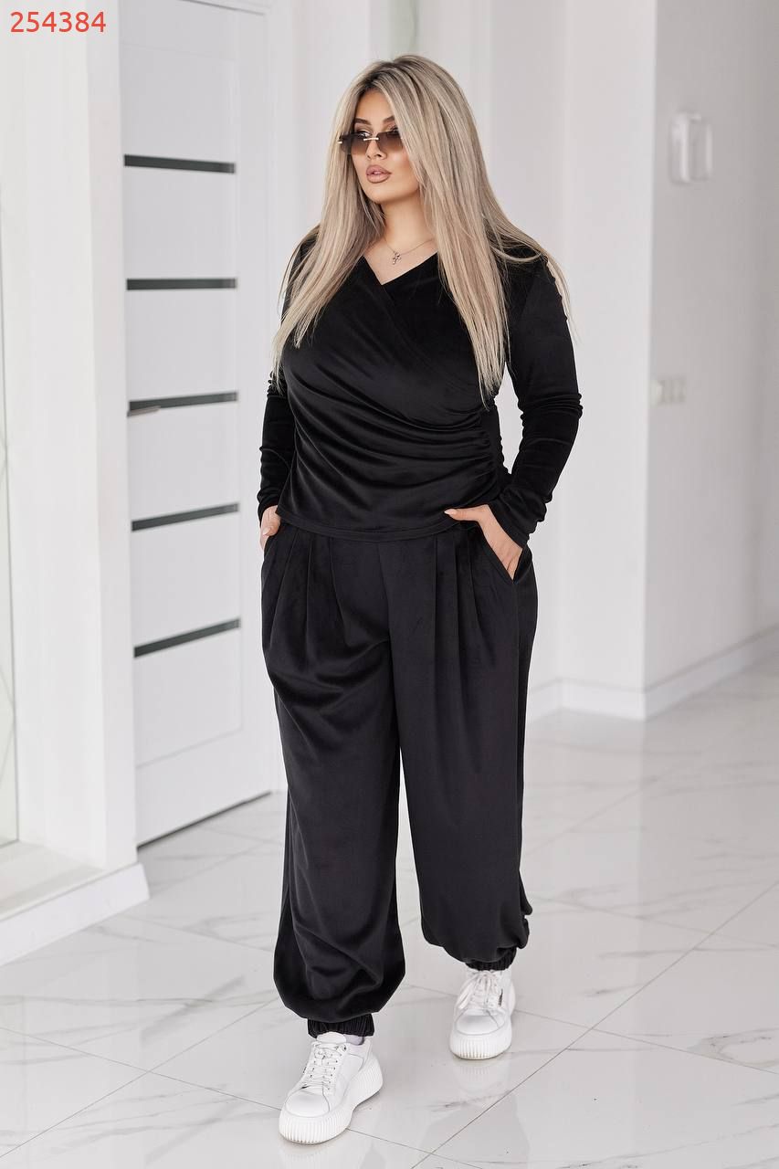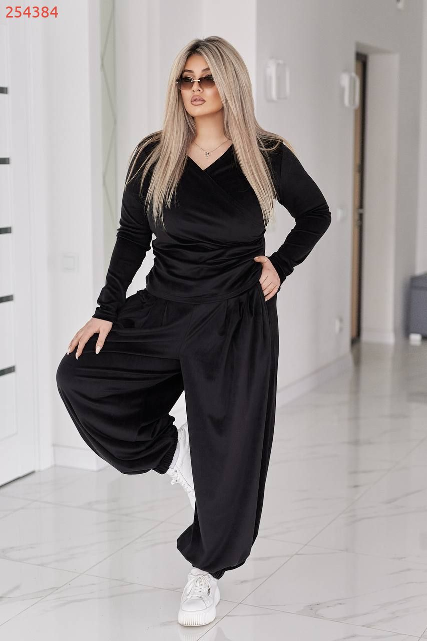 Стильний жіночий костюм у трендових відтінках, що поєднує комфорт і витончену жіночність. Виконаний з м’якого, приємного до тіла велюру з легким благородним блиском, який красиво переливається при русі.