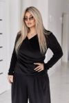 Кофта приталенного силуету, з драпіровкою по переду, яка коригує фігуру, запах з V-подібним вирізом, що візуально підкреслює лінію декольте.