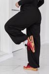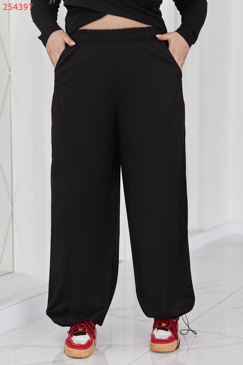 Вертикальні рельєфні лінії візуально подовжують ноги та додають силуету чіткості. Бічні кишені з косим входом практичні й акуратно інтегровані в дизайн. Регульовані гумові затяжки з фіксацією по низу штанів дозволяють зробити бажану ширину і довжину.