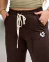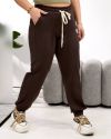 Штани прямого силуету з легким звуженням донизу, ідеальної посадки, пояс на широкій резинці з контрастним шнурком для регулювання об’єму, зручні бокові кишені, вертикальні рельєфні шви, що візуально подовжують силует. Низ штанин – на манжеті, прикрашені невеличкою лаконічною наліпкою.