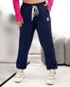 Штани прямого силуету з легким звуженням донизу, ідеальної посадки, пояс на широкій резинці з контрастним шнурком для регулювання об’єму, зручні бокові кишені, вертикальні рельєфні шви, що візуально подовжують силует. Низ штанин – на манжеті, прикрашені невеличкою лаконічною наліпкою.