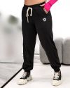 Штани прямого силуету з легким звуженням донизу, ідеальної посадки, пояс на широкій резинці з контрастним шнурком для регулювання об’єму, зручні бокові кишені, вертикальні рельєфні шви, що візуально подовжують силует. Низ штанин – на манжеті, прикрашені невеличкою лаконічною наліпкою.