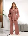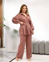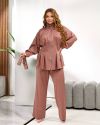 Жіночий костюм, що складається з блузи на блискавці та широких штанів.