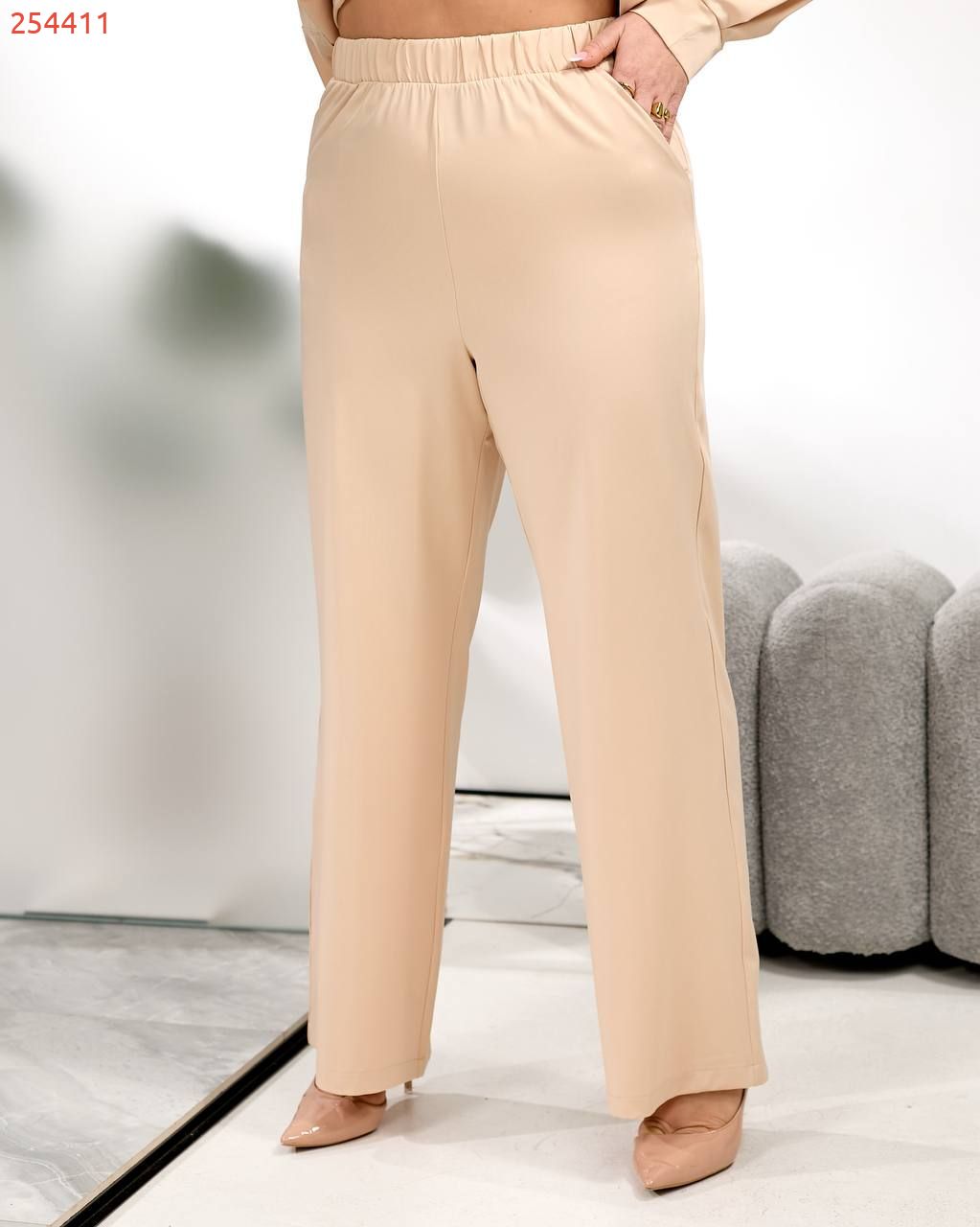 Штани вільного крою прямі, посадка висока, в поясі на гумці, з кишенями.
