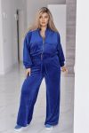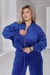 Велюровий оксамитовий костюм складається з кофти і штанів. Кофта вільного крою oversize, з застібкою блискавкою і коміром стійкою. В рельєфних швах спереду є кишені. Рукав зі спущеною лінією плеча, манжети на рукавах та низ кофти на еластичній широкій резинці.