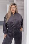 Велюровий оксамитовий костюм складається з кофти і штанів. Кофта вільного крою oversize, з застібкою блискавкою і коміром стійкою. В рельєфних швах спереду є кишені. Рукав зі спущеною лінією плеча, манжети на рукавах та низ кофти на еластичній широкій резинці.
