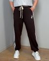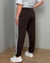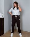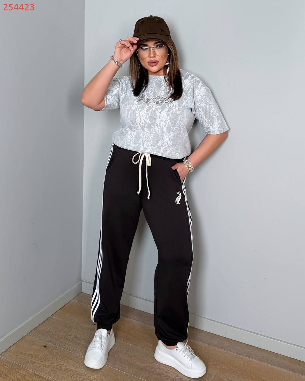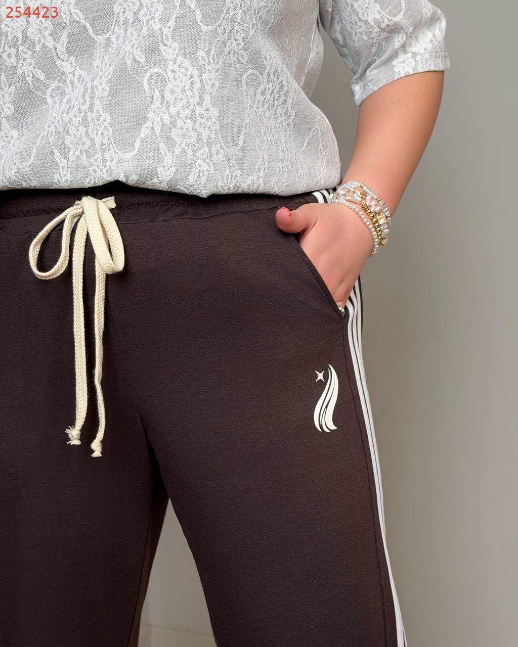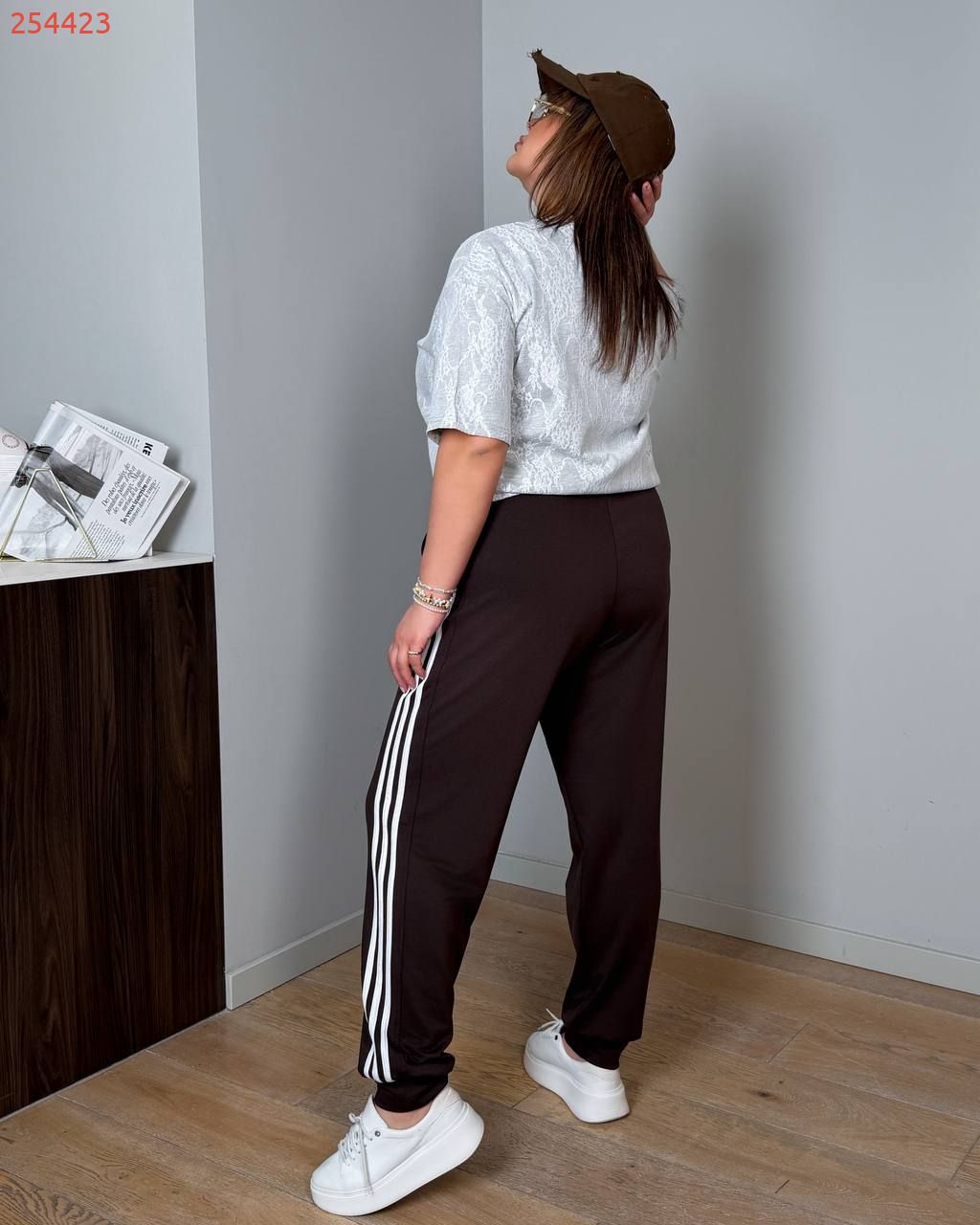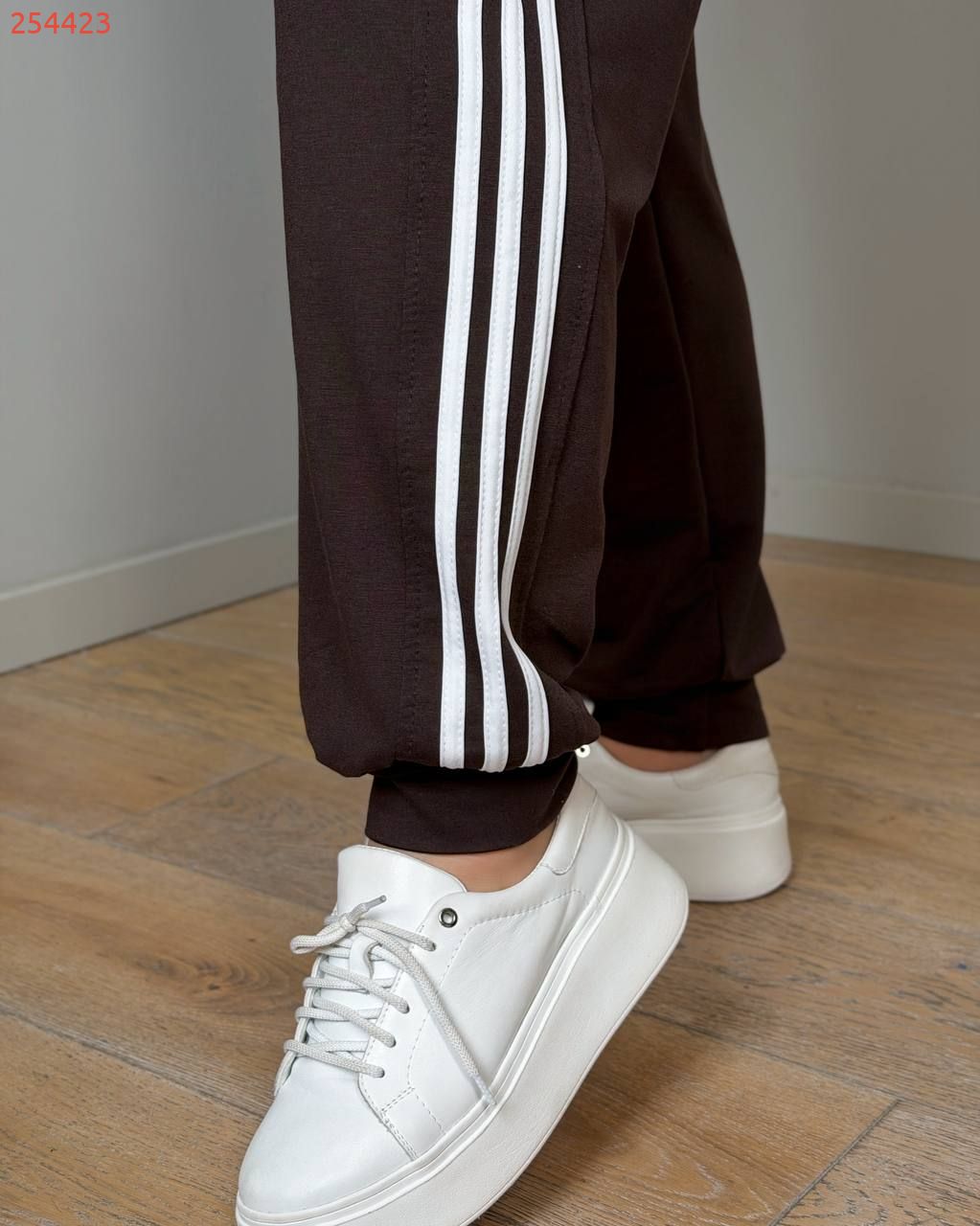 Жіночі штани спортивного типу прямого вільного крою , середньої посадки, пояс на резинці з виведеним шнурком для регулювання об’єму. З кишенями, по бокових швах – подвійні контрастні лампаси.