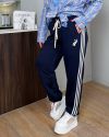 Жіночі штани спортивного типу прямого вільного крою , середньої посадки, пояс на резинці з виведеним шнурком для регулювання об’єму. З кишенями, по бокових швах – подвійні контрастні лампаси.