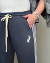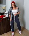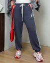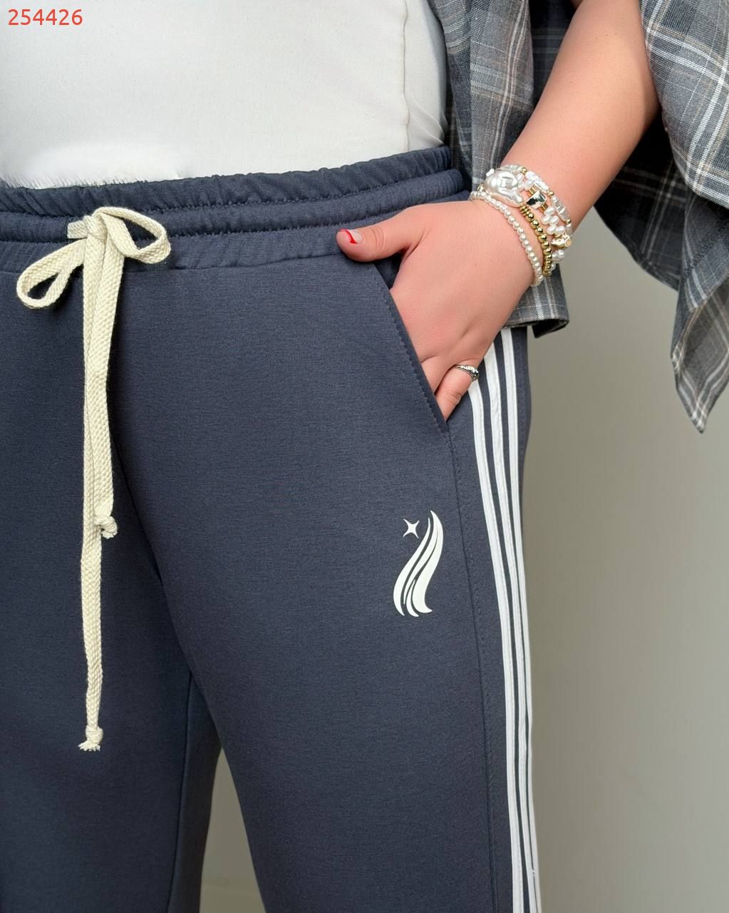 Жіночі штани спортивного типу прямого вільного крою , середньої посадки, пояс на резинці з виведеним шнурком для регулювання об’єму. З кишенями, по бокових швах – подвійні контрастні лампаси.